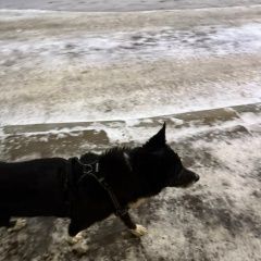 Московская область, Химки, микрорайон Сходня, Больничный проезд 1. Пёсик второй день ходит возле дома, не агрессивный, кормить разрешает, к людям подходит (особенно к мужчинам прям бежит, носом обтирается, бедняга). Цвет черный(темный), лапки и грудка - белые. Хромает на заднюю лапку. На нем шлейка и оторванный поводок.