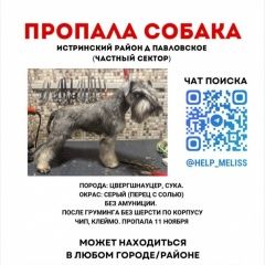 ПРОПАЛА СОБАКА  (Цвергшнауцер) МО, Истринский район, д. Павловское 11. 11. 2025 Цвергшнауцер, сука. Окрас: серый (перец с солью) Без амуниции.. ВОЗНАГРАЖДЕНИЕ .. рублей Чат поиска: https://t. me/help_meliss