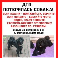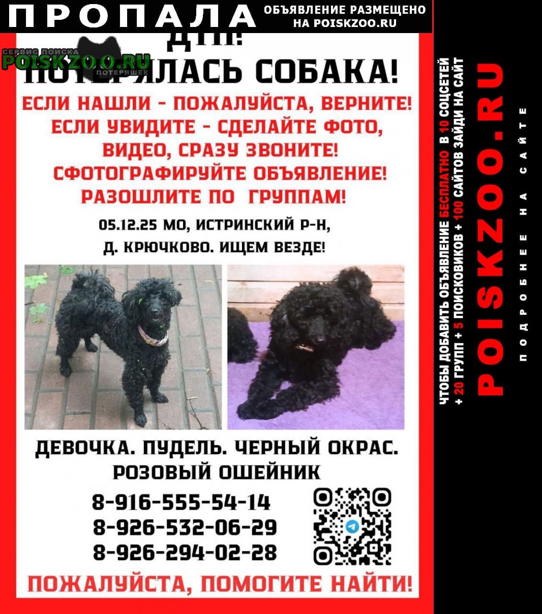 Пропал(а) собака Деревня Крючково, Истринский район 05. 12. 2025 г. 05. 12. 2025 г. приблизительно в 21. 30 в деревне Крючково Истринского района, произошла авария. Во время аварии из машины выскочила собака, девочка, карликовый пудель, чёрного цвета и убежала. На хвостике есть немножко светлой шерсти. На ней был ошейник розового цвета.