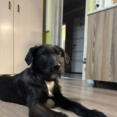 Найдена собака, подросток, мальчик с ошейником. Окрас черный с белой грудкой.