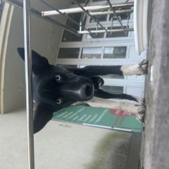 Нашлась собака, домашняя судя по всему. Голубые глаза, фиолетовый ошейник, девочка..