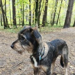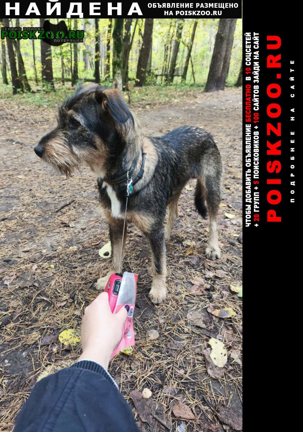 Найдена собака в лесу г. Котельники. До этого была замечена в метро на фиолетовой ветке. Собака в двух ошейниках (обычный и от блох), на нем подвеска в виде голубого сердечка.
