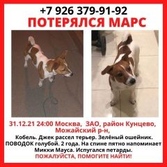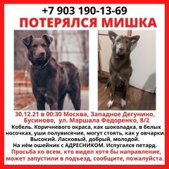 30. 12. 21 в 00:30 испугавшись салюта, убежала собака от дома 8 по ул. Маршала Федоренко. Кобель, коричневого окраса, как шоколадка, в белых носочках, уши полувисячие, по кличке Мишка. Очень ласковый, добрый, молодой...