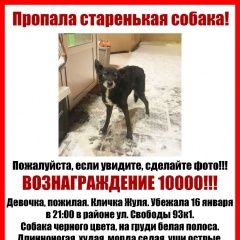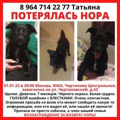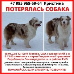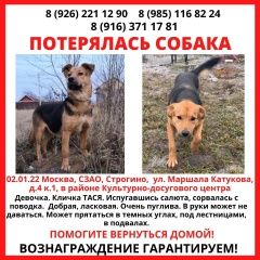 В районе Культурно-досугового центра, в ночь на 2 января 2022г. испугавшись взрывов петард и салюта убежала, сорвавшись с поводка. Добрая, ласковая, девочка. Кличка ТАСЯ. Чужим, в руки может не даваться, боится. Может..