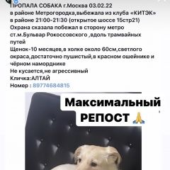 Помогаю информационно Москва Метрогородок потерялась собака ПРОПАЛА СОБАКА в районе Метрогородка, выбежала из клуба «КИТЭК» в районе 21:00-21:30 (открытое шоссе 15стр21) Охрана сказала побежал в сторону метро ст. м...