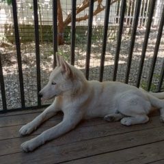 Белая хаски, девочка, глаза разные, левый голубой, правый карий, довольно упитанная, возраст чуть больше года. Очень ласковая, но чужих людей может немного бояться. Совершенно домашняя, одна никогда не гуляла, ничего не знает об уличной жизни. Привыкла к натуральному питанию. С кошками и другими домашними животными не ладит.