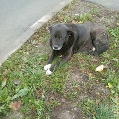 Собака лежит четыре дня напротив главного входа в больницу 15 Санкт- Петербурга на зелёном газоне