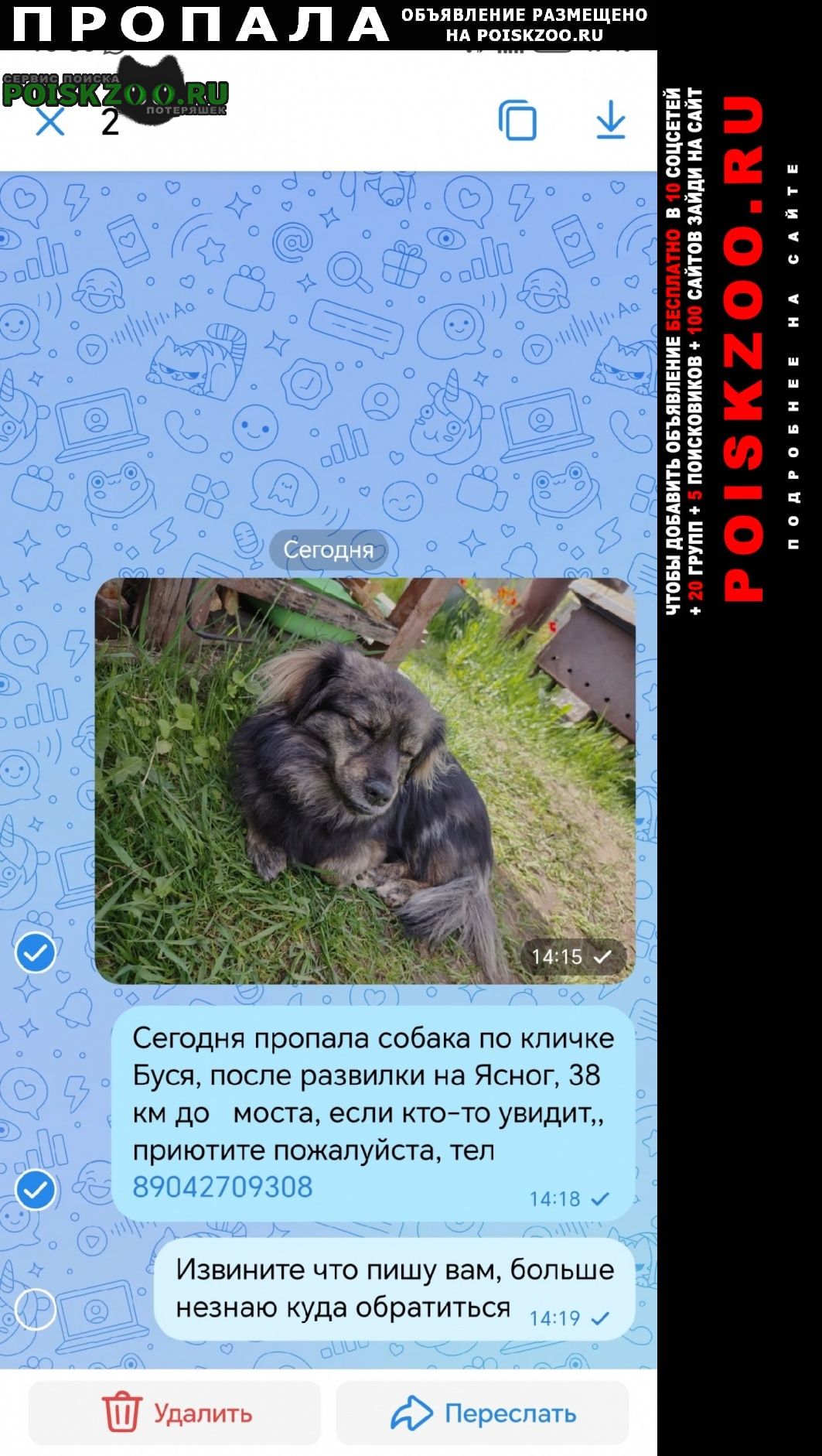 Объявление о том, что пропала собака размещено в соцсетях: